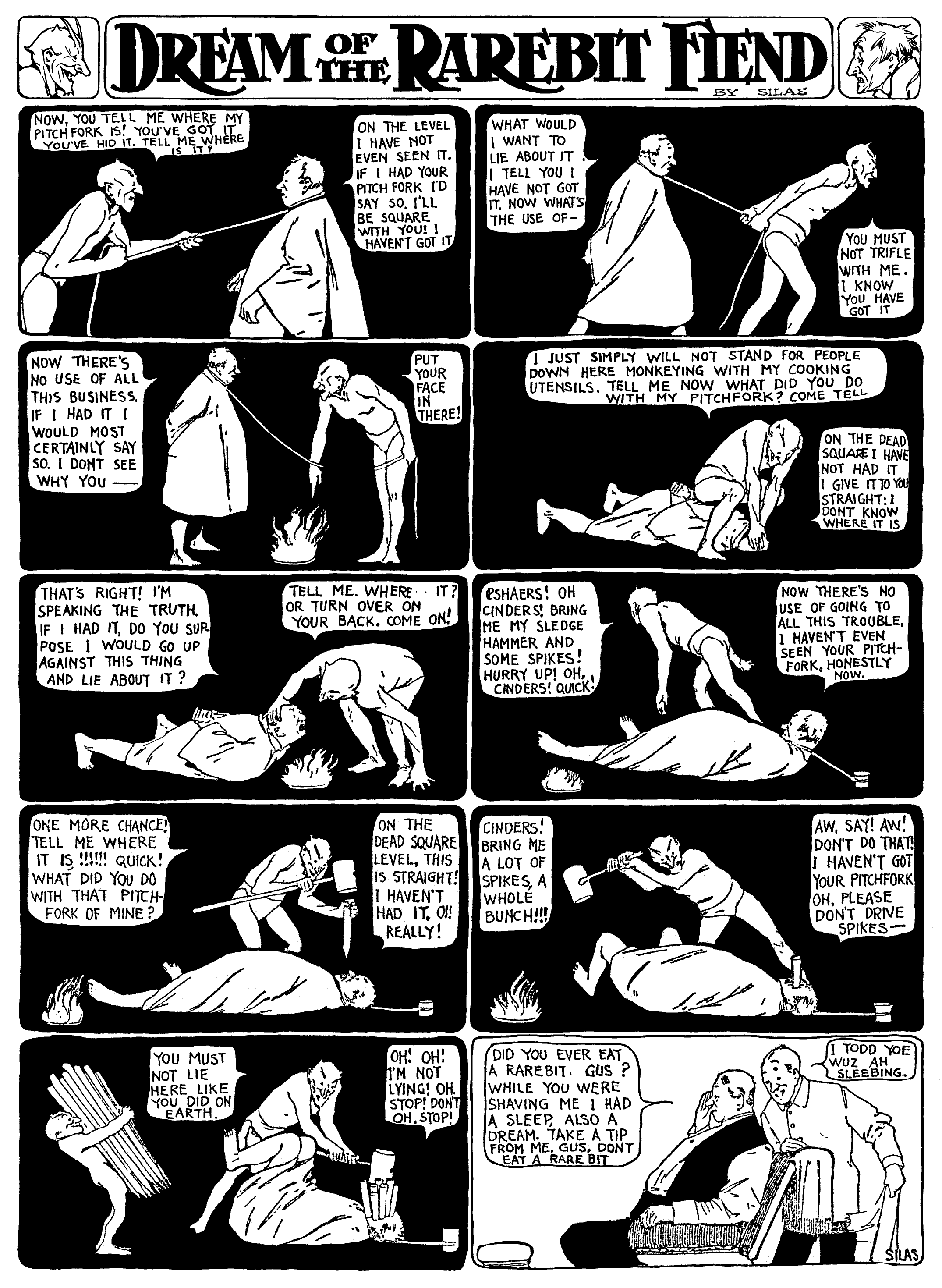 Summary | The devil drives spikes into the face of a dreamer suspected of stealing his pitchfork. |